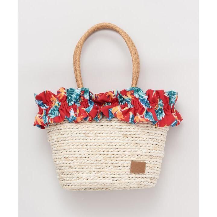 HAWAIIを連想させるボタニカルのフリルがポイントの巾着タイプのトートバッグ。